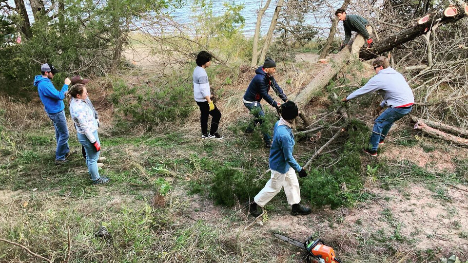 A College of Architecture team is repurposing invasive eastern redcedar trees to create Mizer Ruin, a micro-dwelling structure at Cedar Point Biological Station.