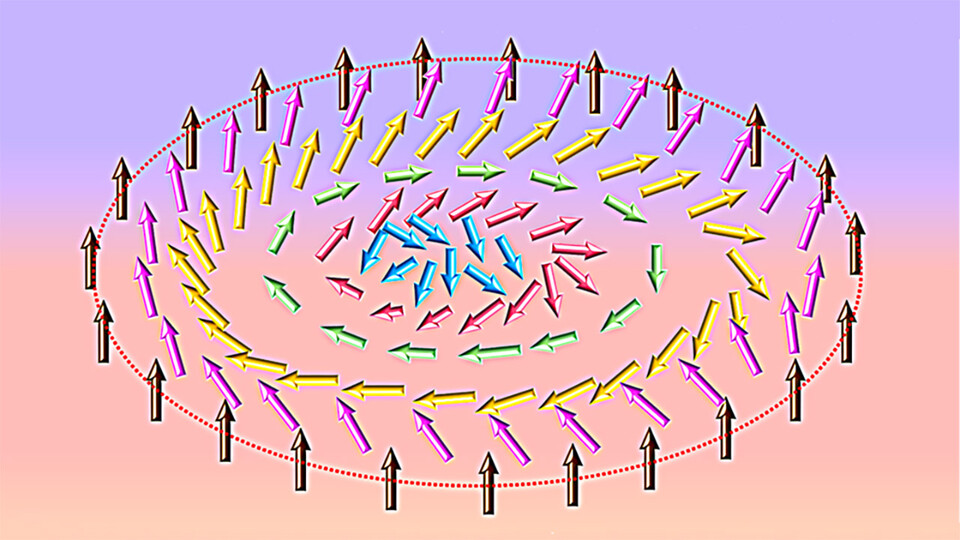 The particle-like magnetic configurations are called skyrmions (SKUR’-mee-ahns), a set of atoms whose poles, or magnetic moments, tilt further and further away from the magnetic axis as they approach the skyrmion’s center, with the atom at its core pointing in the opposite direction of that axis. These structures have the potential to improve data storage and processing in multiple computer applications.