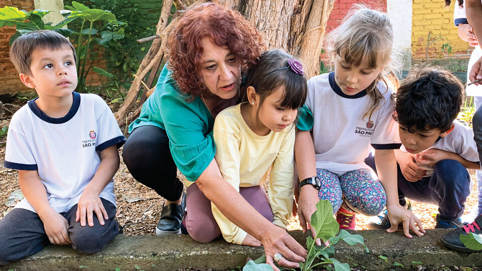 Tucked away from the busy city streets of São Paulo, Brazil, young learners are exploring a colorful garden with spades, magnifying glasses and other tools. They gather around their preschool teacher who is holding a freshly dug worm in her hands. They observe the wriggling creature together. After the excited shrieks subside, the teacher begins to ask them questions.