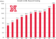 UNL's research has grown significantly over the past 10 years. Total research funding increased 180 percent since 2000, when funding was $49.6 million.