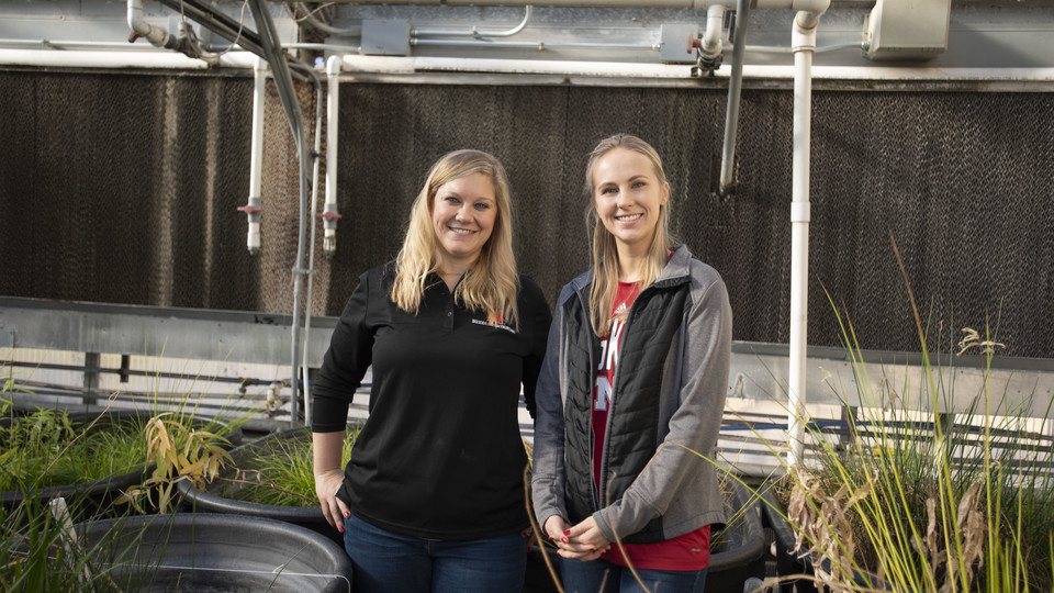 During the summer, the garden contains 30,000 living plants, bright bursts of color layered upon layer on the pocket of land where koi fish swim in their ponds. It is here that Alexa Davis, graduate student with the School of Natural Resources, first anchored her floating treatment wetland, a collection of 12 Nebraska-native wetland sedges and milkweed “planted” in the holes of a buoyant rubber mat, the roots hanging down into the shallow water.