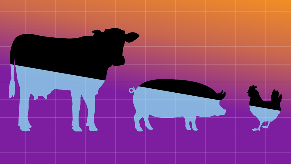 Relying on data from the U.S. Department of Agriculture and other sources, the team analyzed the annual U.S. outputs of beef, pork, poultry and milk from 1960 to 2016. The researchers also estimated the yearly amounts of water invested in each class of livestock: the rainfall and irrigation needed to grow grains and other livestock feed; the drinking water those livestock consumed; the water used to clean the animals and their living quarters.