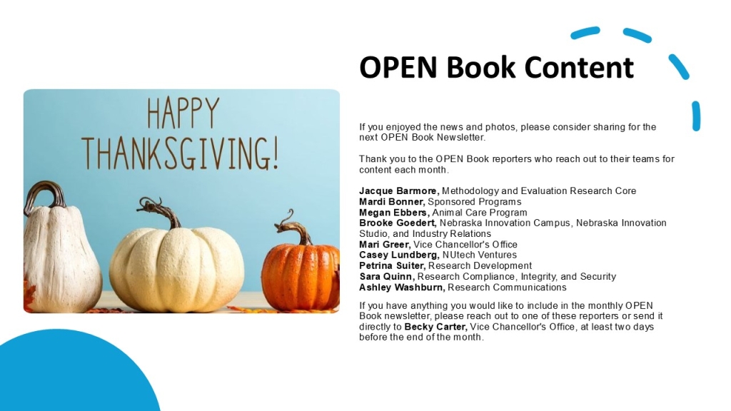 OPEN Book is the Office of Research and Innovation’s internal monthly electronic newsletter that highlights upcoming activities, office news, and accomplishments.  The OPEN Book newsletter is sent on the last business day of the month.