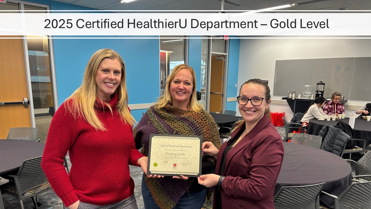 The Certified HealthierU Department program recognizes campus units that actively promote the well-being of their employees and equip them with the knowledge and resources to live healthier and happier lives. To achieve gold level, a department must have at least 25 points from all 8 of the dimensions of wellness. Accepting the recognition for the Office of Research and Innovation was (left to right) Brooke Goedert (Nebraska Innovation Campus) and Becky Carter (Research and Innovation) with Annalisa Davenport (UNL Employee Wellness). To learn more about the program visit https://healthieru.unl.edu/department-well-being/certified-healthieru-department/.
