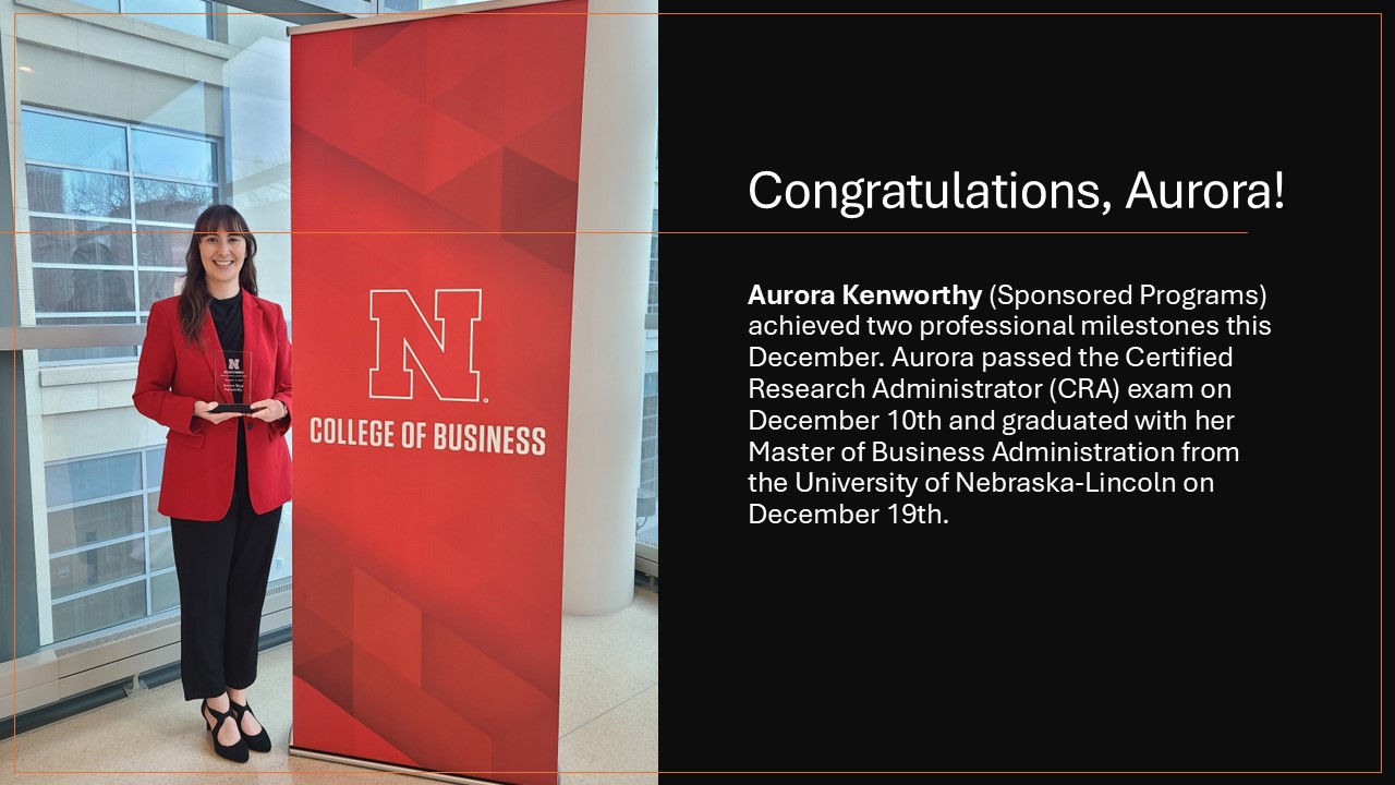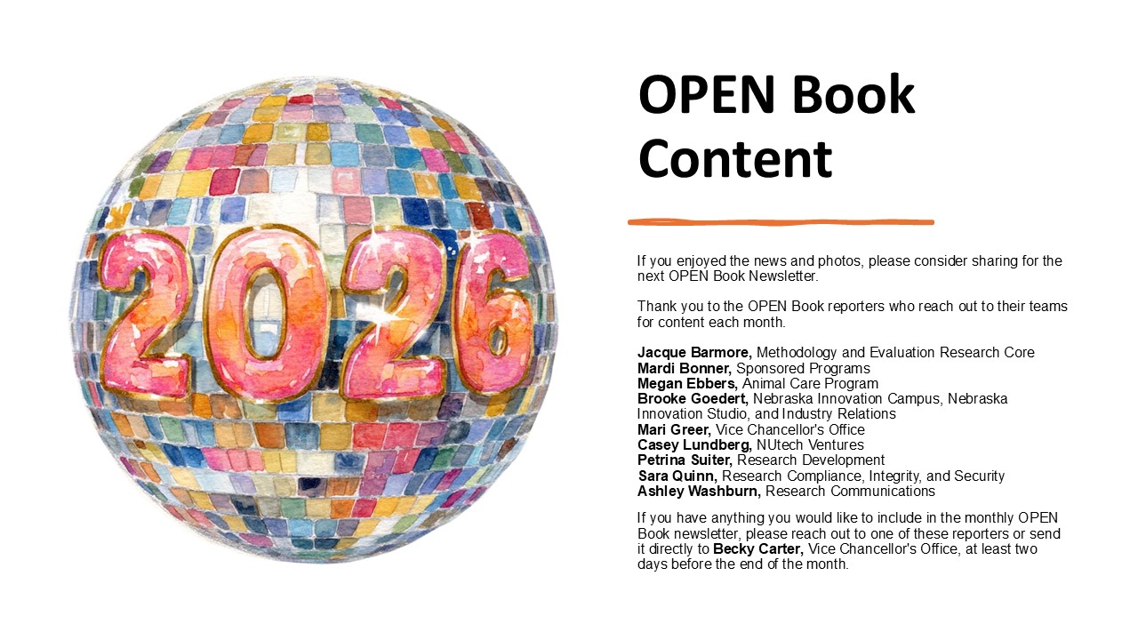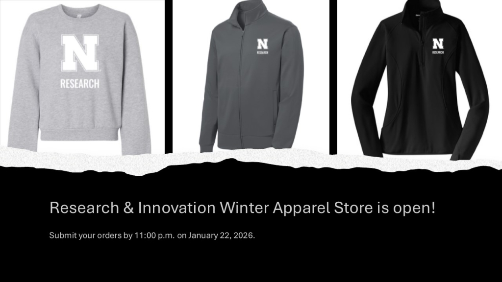The Office of Research and Innovation has launched on online apparel store. To show you our appreciation for all the work you are doing to support and elevate Nebraska Research, R&I will cover up to $35 of your apparel order. The coupon code is RI2026and can be entered at checkout. The will remain open until 11:00 p.m. on Thursday, January 22nd.