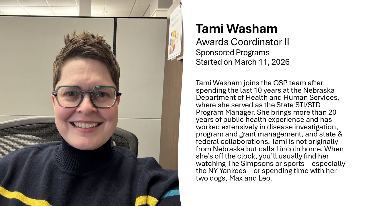 Awards: The 2026 Staff Senate Awards nomination deadline has been extended. Nominate a staff member https://staffsenate.unl.edu/staff-senate-recognition/ by Wednesday, April 15.